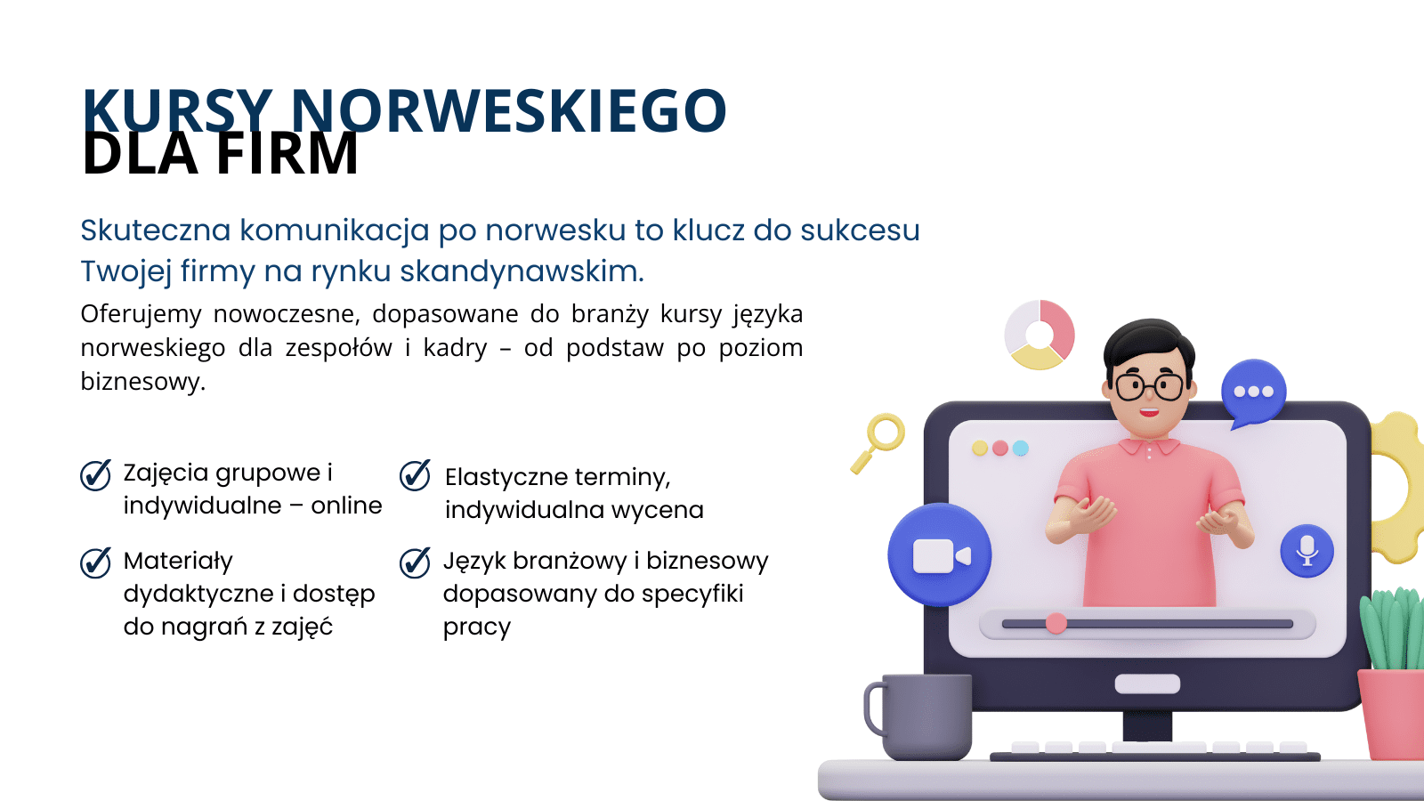 Znajomość języka norweskiego to kluczowy atut w komunikacji z kontrahentami, klientami i zespołami w Norwegii. Oferujemy kompleksowe kursy dla firm, których pracownicy pracują za granicą, współpracują z norweskimi partnerami lub przygotowują się do pracy na tamtejszym rynku.